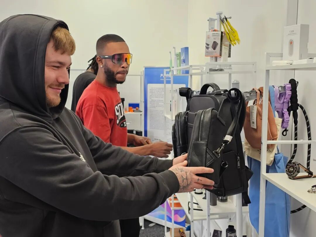 位于英国伦敦的“宝安优品·梦甄选”展厅内,两名海外企业代表正在选品